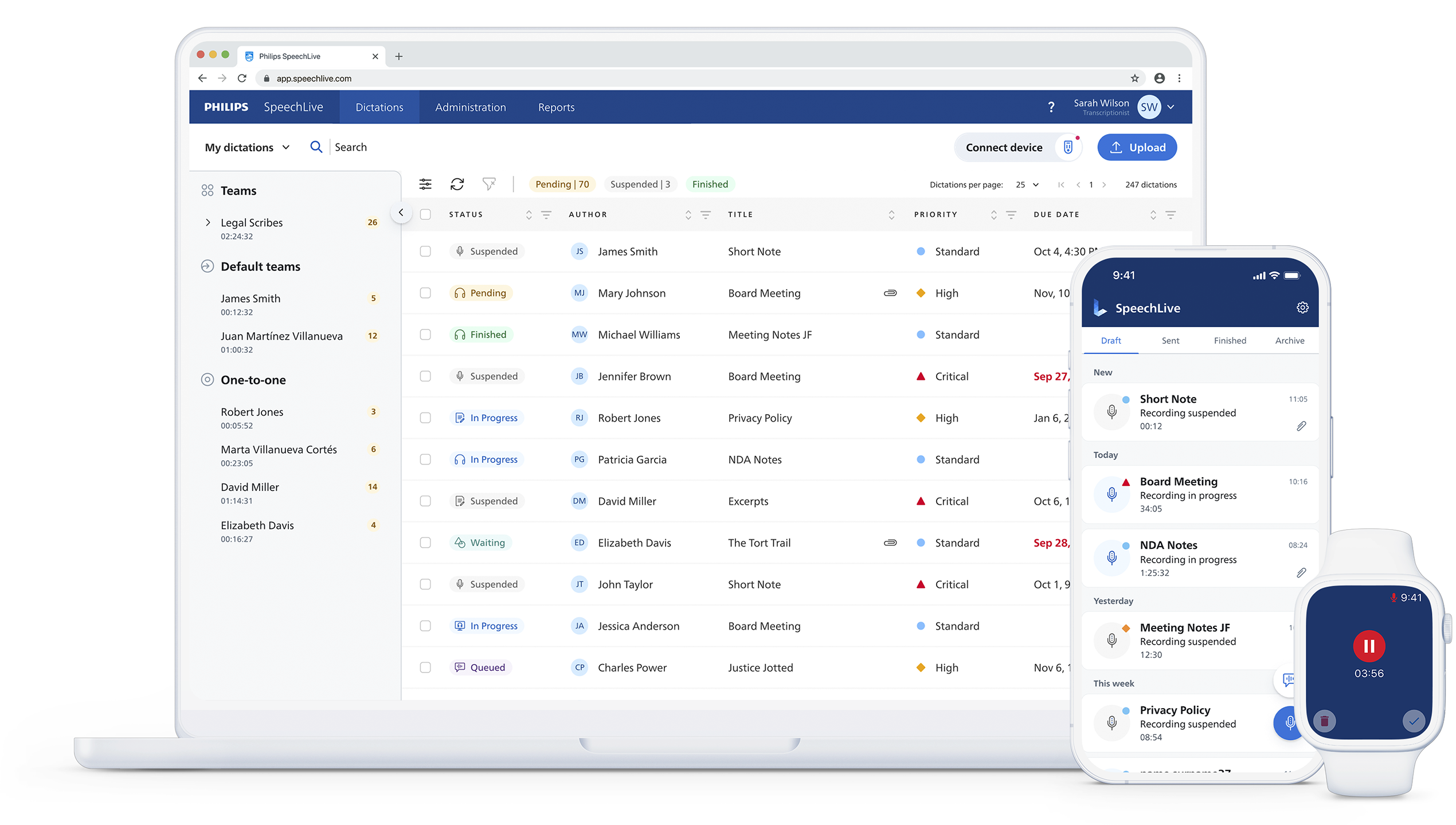 Philips SpeechLive bietet Ihnen alles, was Sie brauchen, um Diktate effizient zu erfassen, zu transkribieren und zu verwalten. Ganz gleich, ob Sie unterwegs Notizen aufzeichnen oder Diktate an Ihr Team weiterleiten, SpeechLive bietet intelligente Tools zur Unterstützung Ihres Workflows – und flexible Optionen, um ihn noch weiter auszubauen. Die cloudbasierte Plattform vereinfacht das Diktieren und Transkribieren und macht es jederzeit und überall zugänglich. Genießen Sie den Komfort unserer KI-gestützten Lösung, die sich flexibel an Ihre Bedürfnisse anpasst.